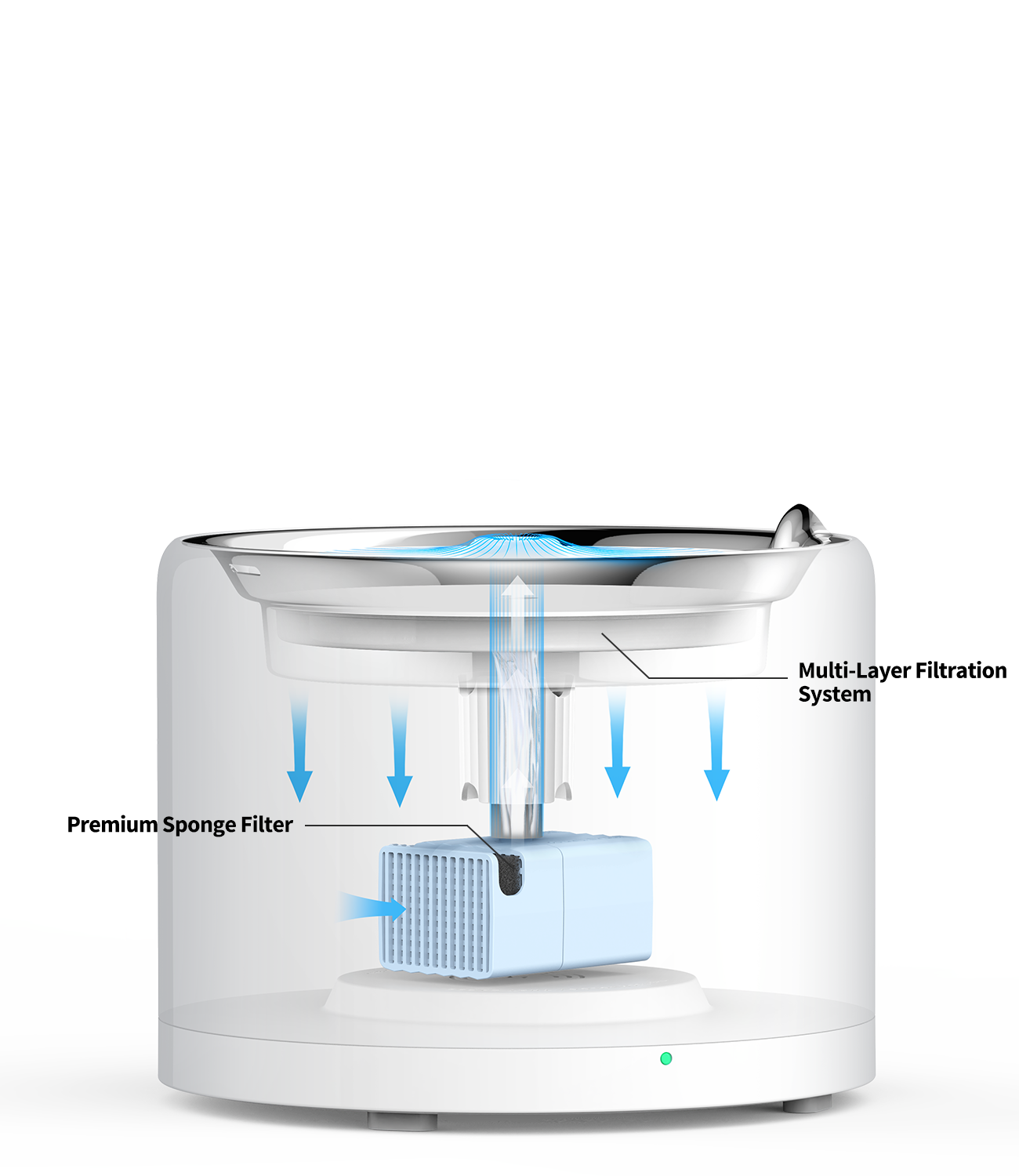 【Indicator Light】When the GREEN LIGHT is on, the fountain is in smart working mode, it pumps 3 mins and rest 3 mins. When the BLUE LIGHT is on, the fountain is in normal working mode, provides uninterrupted water flowing. When the green light is flashing, it reminds you to replace the filter, please reset the water fountain after filter replacing. When the blue light is flashing, it reminds water shortage, please refill water.